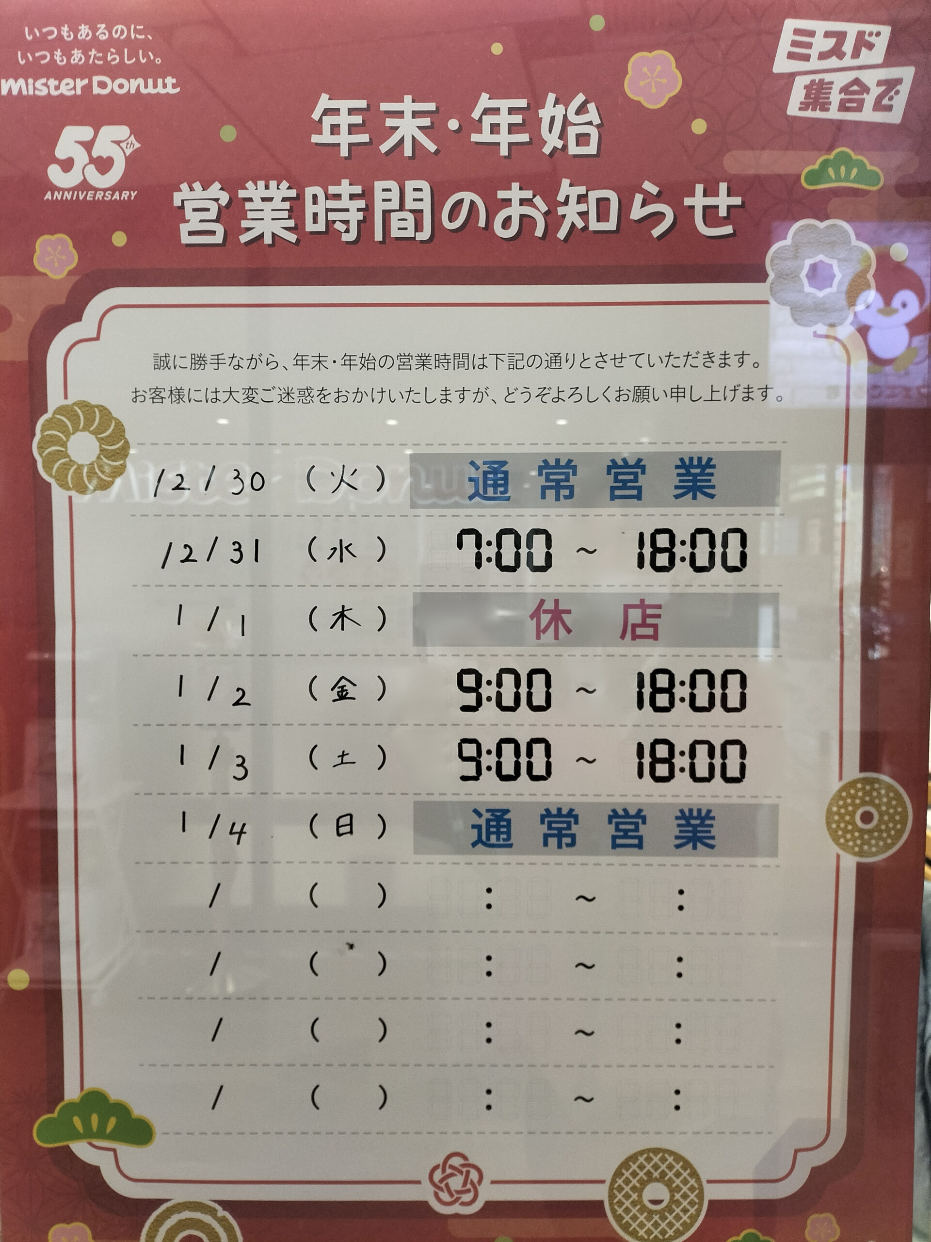 『ミスタードーナツKiTARA豊田駅前店』年末年始の営業時間のお知らせ