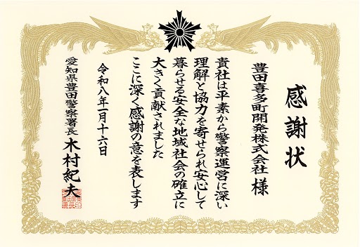 2026年1月16日、当施設の管理運営会社(豊田喜多町開発株式会社)が、豊田警察署長様より感謝状をいただきました。